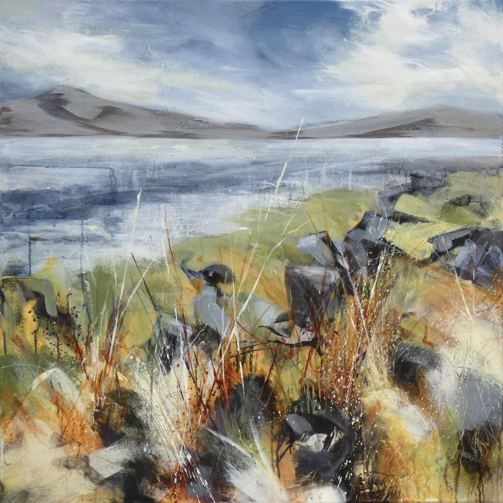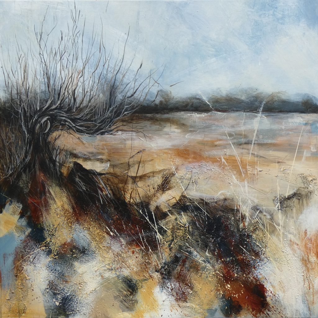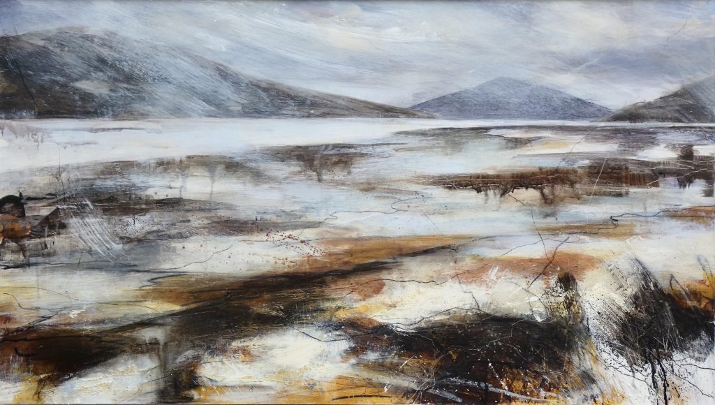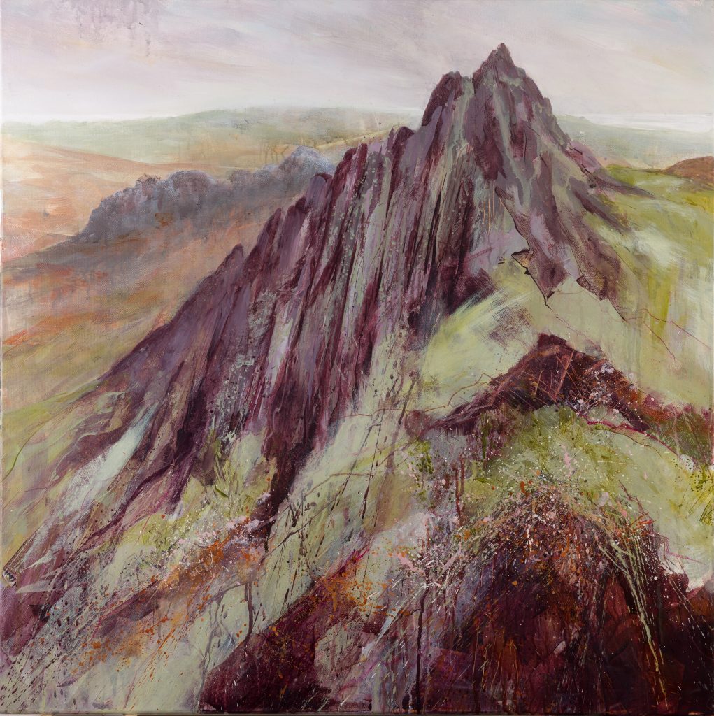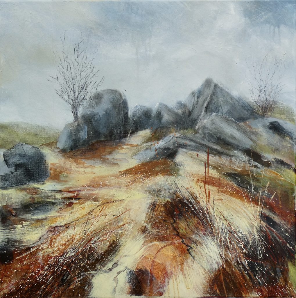 Bron works primarily in acylics on canvas and panels. She works in the landscape making marks quickly to focus her attention on glimpses, capturing first impressions of textures and shapes, and recording the landscape from different perspectives. Blind sketching back in the studio helps to further abstract the landscape and focus on feelings and impressions. She uses glazing, scratching and sanding through the layers to expose what lies beneath: subtleties of texture and colour that add to the overall feel of the painting. She enjoys experimenting with marks, often with materials found on her walks, and working more intuitively without an end design in mind, to bring the spontaneity of nature into her creative process and evoke the wild beauty of the Welsh landscape. Her ceramics evoke the wild beauty of the landscapes through the use of Kurinuki and Raku firing, and the use of the natural materials from location to create organic colours and glazes.