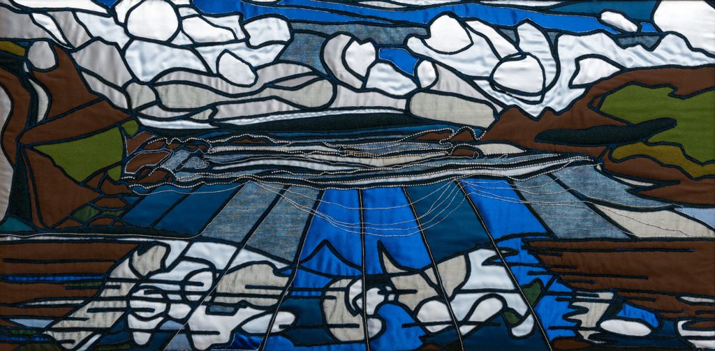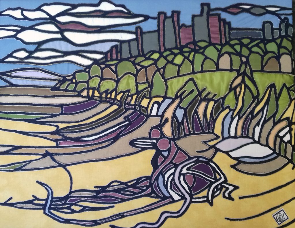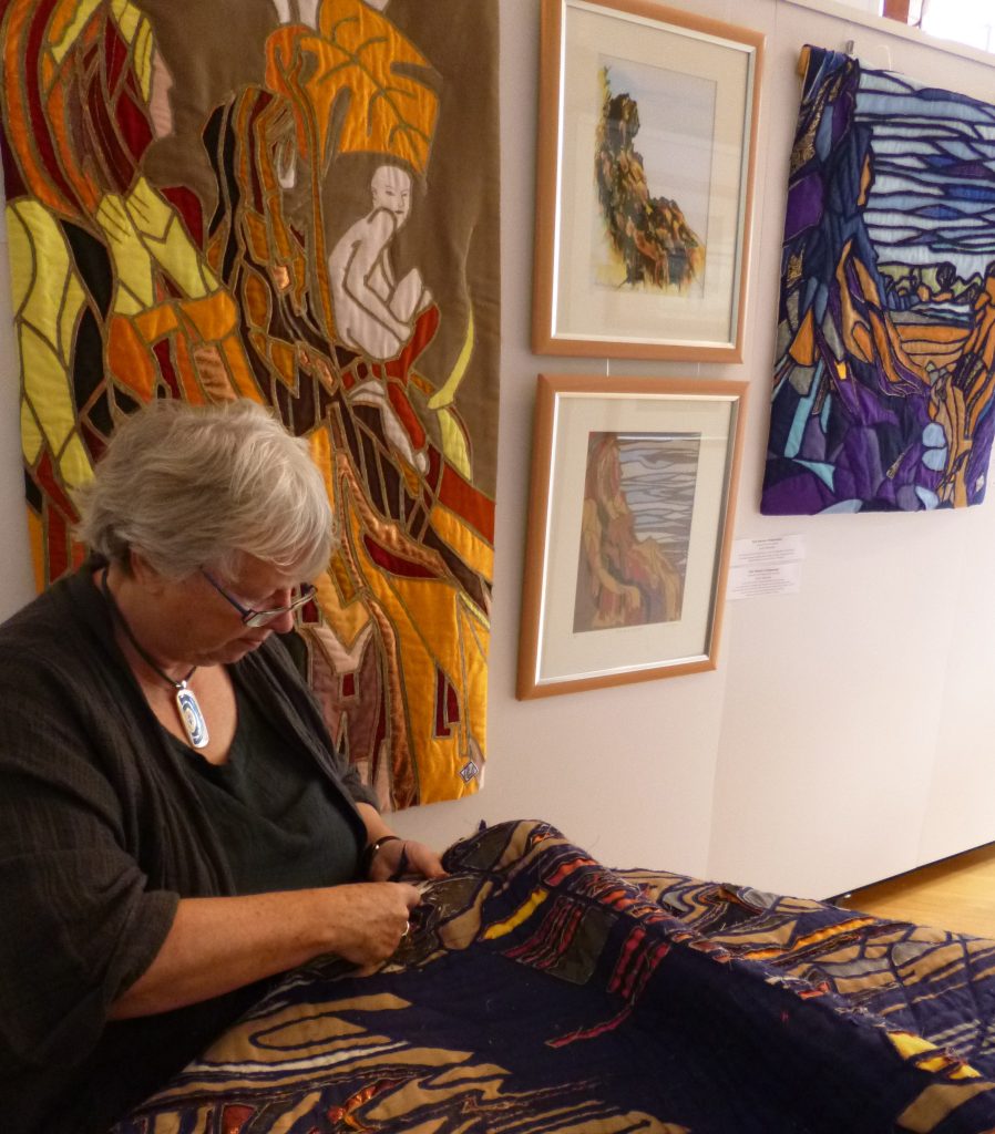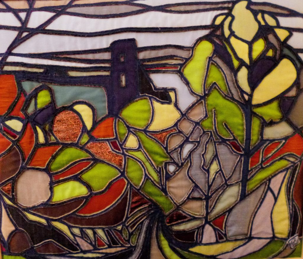 Initially, water-colour paintings are created. Some are transformed into my own Intaglio Strati Textile Relief technique for art quilts or framed panels – akin to stained glass in style.