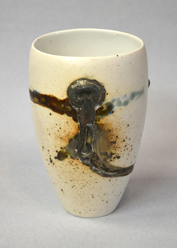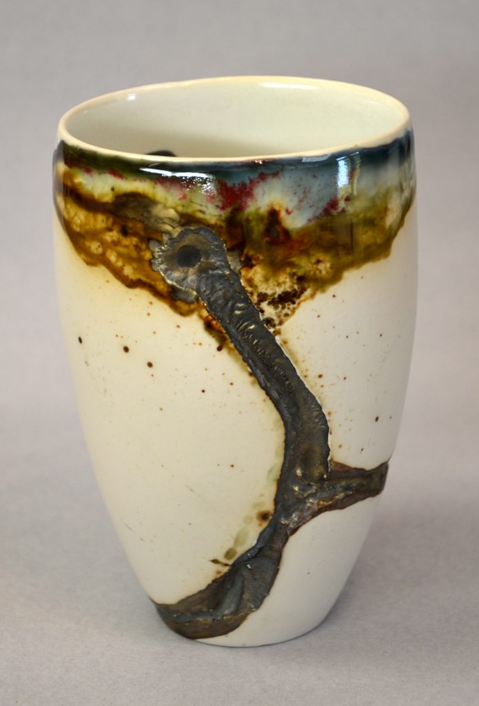 My current work explores the concept of ‘Entanglement’; of materials, histories and lives. I use specialised chemistry and firing techniques developed over several years to allow reclaimed items of steel to flow as their life history dictates, becoming a completely fused and integral part of the ceramic work.